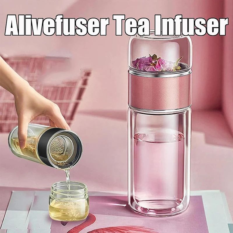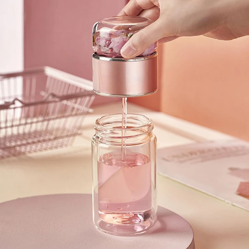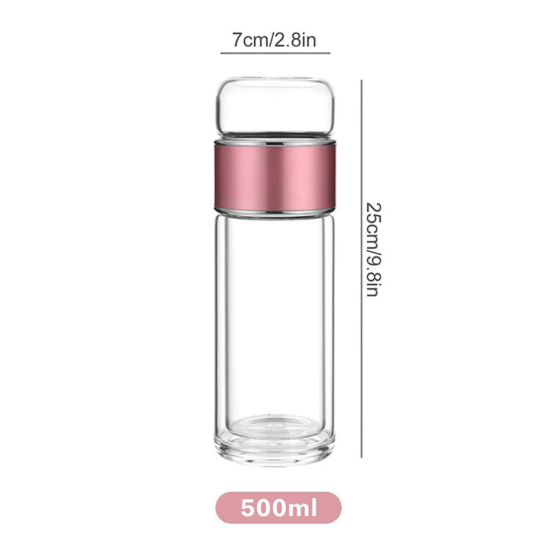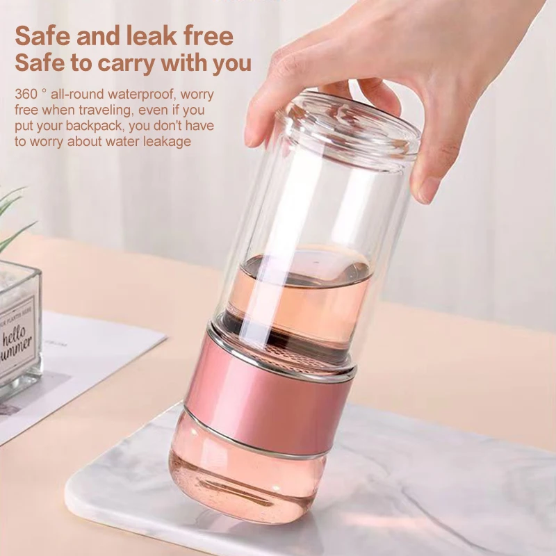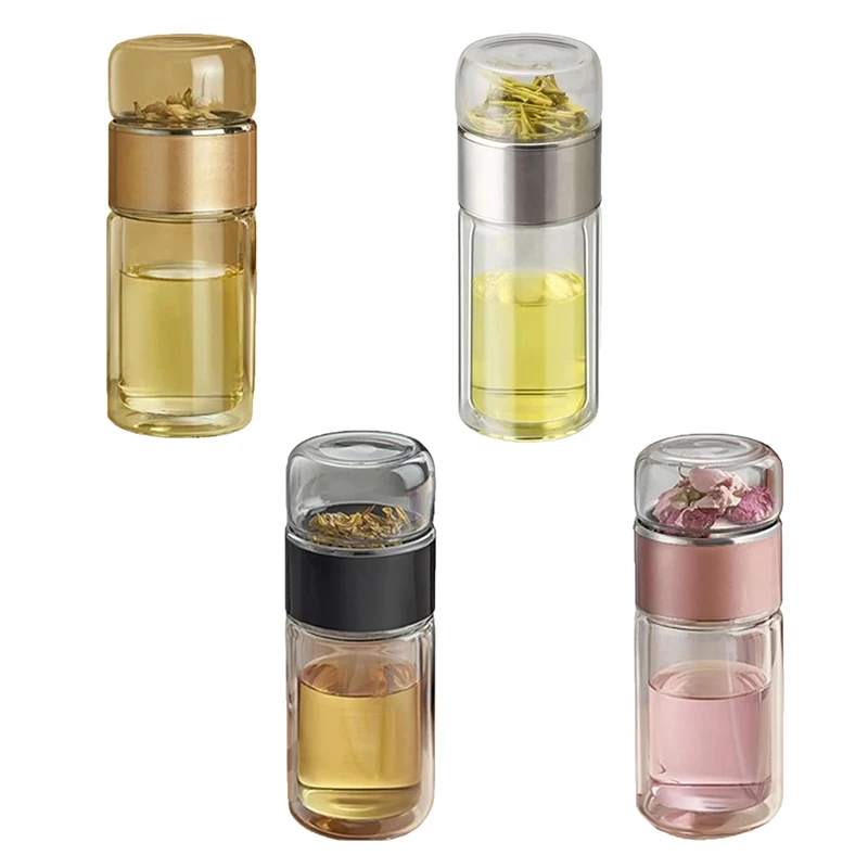 4. Estilo moderno: A garrafa para chá com separador de água e design moderno e cores requintadas permite que você desfrute de suas bebidas de chá favoritas em qualquer lugar. A garrafa de vidro duplo para chá aprimorará sua experiência de beber chá quente e gelado, melhorando seu estilo de vida.